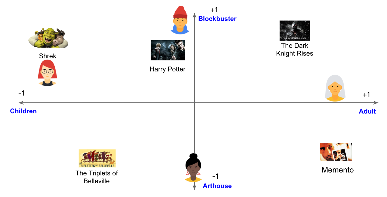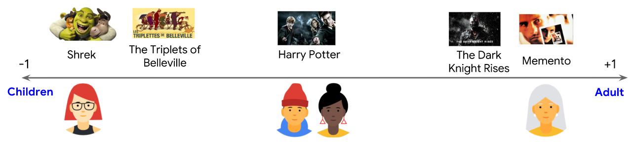 假设我们给每个电影赋一个[-1,1]的值来描述这个电影是适合儿童(-1)还是成人(1)。同时我们给每个用户赋一个[-1,1]的值来描述这个用户是喜欢儿童电影(接近-1)还是成人电影(接近+1)。