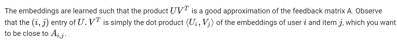 学习到的embedding使得U和V两个矩阵的乘积能非常接近反馈矩阵A。注意到矩阵U和矩阵V乘积的每个实体(i,j)就是用户i的embedding和物品j的embedding的点积。你希望这个点积和A(i,j)更接近。