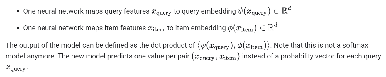 模型的输出可以定义为query embedding和item embedding的点积。注意,这不再是一个softmax模型。这个模型为每一query和item对预测一个值,而不是为query预测一个可能性向量。