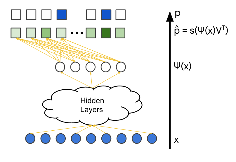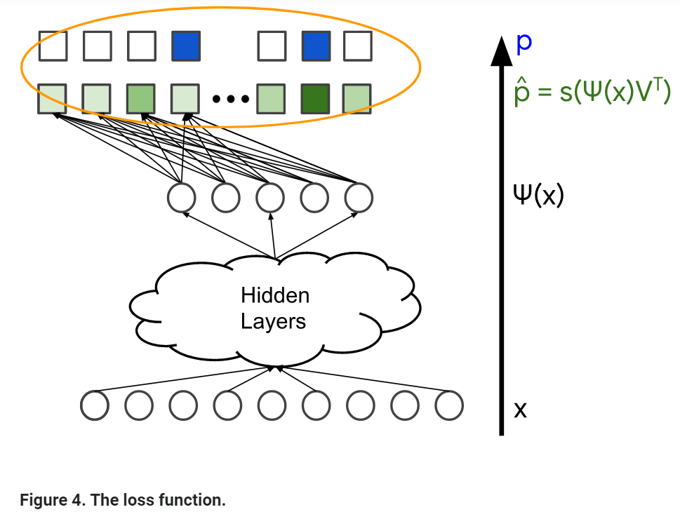 softmax训练数据由query特征x以及和用户交互的物品向量(表示为可能性分布p)。在下图中他们被标记为蓝色。这个模型中的变量是不同层的权重,他们在下图中被标记为橙色。这个模型能使用任何类型的随机梯度下降的方法训练。