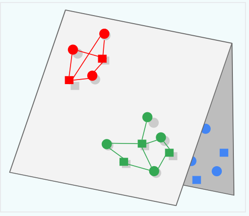 在上图中,我们假设不同的颜色代表不同种类的query和item。每个query(表示为方形)最可能和同种颜色的item(表示为圆形)交互。例如,我们假设分类就是youbute中不同的语言,一个特定的用户只会和这个特定语言的视频交互。