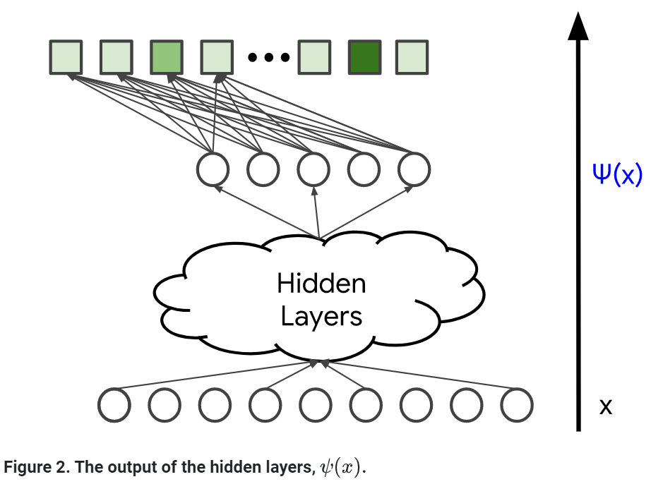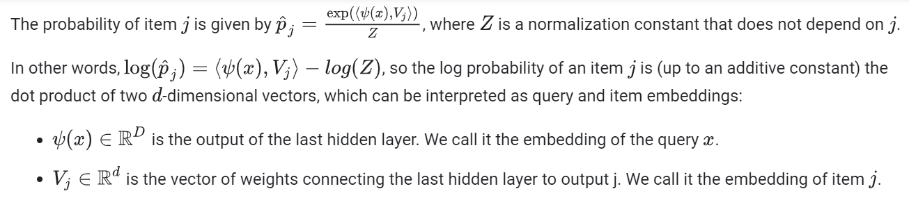 物品j的可能性通过如上公式计算得出,Z是一个标准化使用的常量,它不依赖于j。换句话说,log(p^j)一个物品的可能性的log值是两个d维向量的点击,这两个d维的向量也可以表示为用户和物品的embeddings - φ(x)∈R(D)是最后一个隐藏层的输出,我们把它省委query x的embedding
