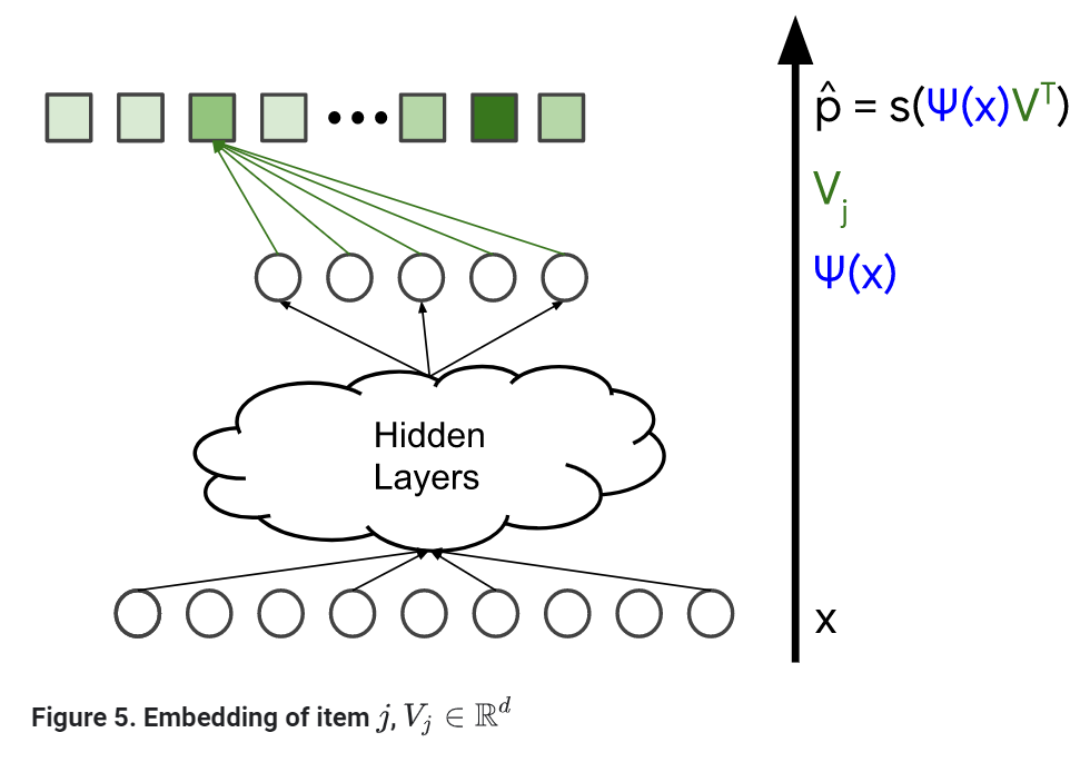 - V(j)∈R(d)是连接最后一个隐藏层到输出j的权重向量,我们把它称为物品j的embedding。